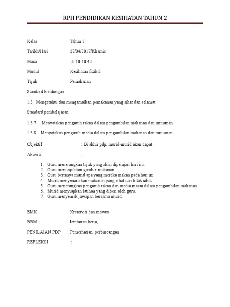 Model Rph Pendidikan Kesihatan Kump 2 Pdf